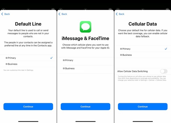Depending on the eSIM, you might see a couple of settings screens like Cellular Plan Labels, Default Line, iMessage & FaceTime, and Cellular Data after installing it.