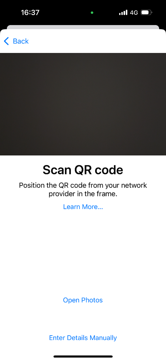 2. Once you are on the Set Up eSIM screen, tap on “Use QR Code”. Then, you will be taken to the scanning screen. Here, scan the QR code that is provided to you by the eSIM service.